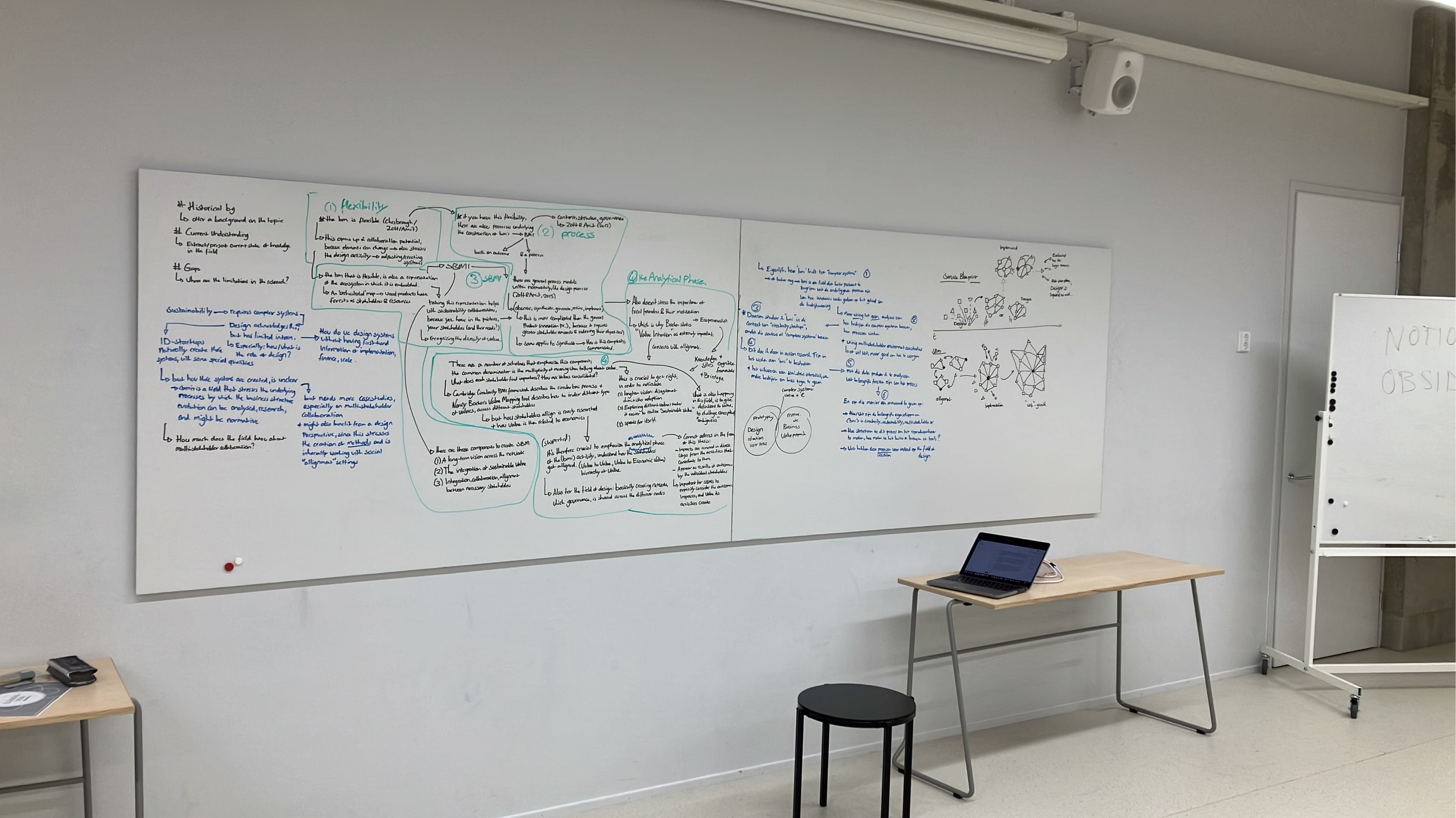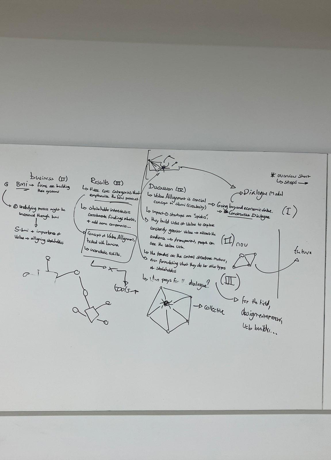 My thesis approach began with an embedded action research within a circular startup undergoing the development of a shared business model with four other companies. This phase involved firsthand experience in collaborative systems change, supported by grounded theory methodology. Simultaneously, semi-structured interviews and extensive literature integration were conducted, offering a multi-perspective view on sustainable business model innovation (SBMI) and its intersection with design.